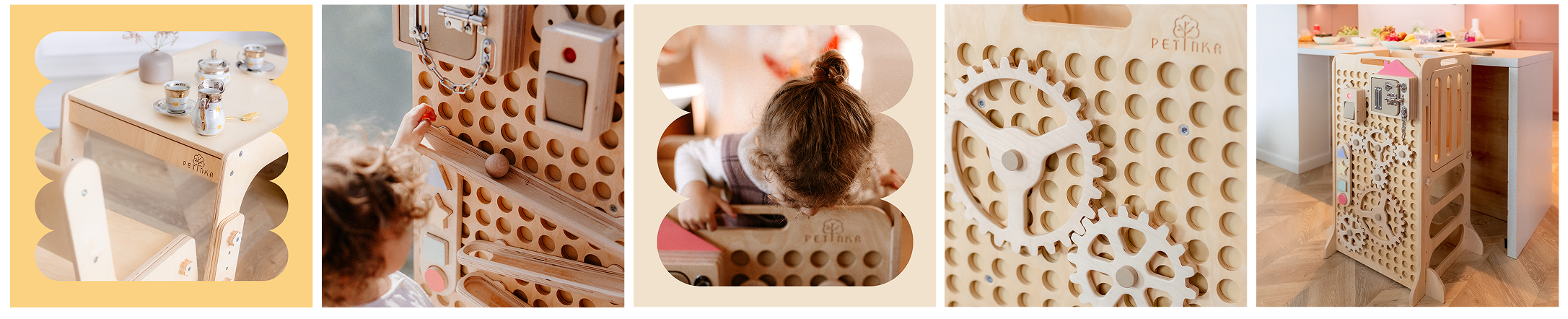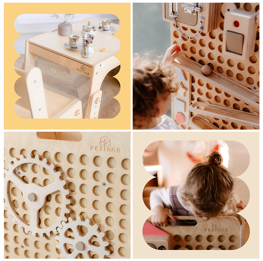 Všetky naše učiace veže, ready to activity steny, stoly a stoličky pre deti, kreatívne detské hračky a detský nábytok slúžia pre rozvoj najmenších a pomoc rodičom. Vyrábame ich z dreva, poctivo a s láskou na Slovensku.